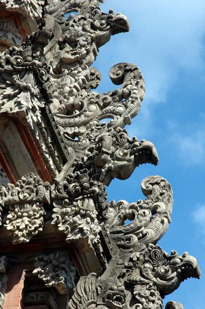 1030 --- We knew we were very near to Denpasar, the 1st stop planned was to get to the memorial monument at the heart of the city (similar to Tugu Merdeka in KL)… but again, we were lost. So we just stopped by 1 temple to visit and take photos. Then we grabbed an uncle on the street and asked for direction… seems that we were just 2 blocks away from it. Then we spotted a temple (supposedly quite famous lah) on the map called Pura Masopahit, one of the oldest temples in Bali, just a street a way from where we were. So we decided to visit it 1st…… then we lost again, kakaka, it seems we have missed a turn, then we got to do a big round back again. The temple is cool, they worship the naga (dragon) god there although at first I mistaken it as snake, haha! The aunty who loaned us the yellow waistband was busy making little tiny baskets for their daily blessing and praying. She chatted with us and also willing to let us take her pictures… 1 thing, she doesn’t look like 64 years old to me! There’s also a bunch of aunties nearby who were really noisy and kepochi, and I seriously believe that they were flirting with us, they just laughed nonstop and joked in their own language. One aunty even wanted to marry a young girl to me after she found out that I’m still single. Wuahahaha!!! Rp.10,000 abt RM4 donation to the temple.